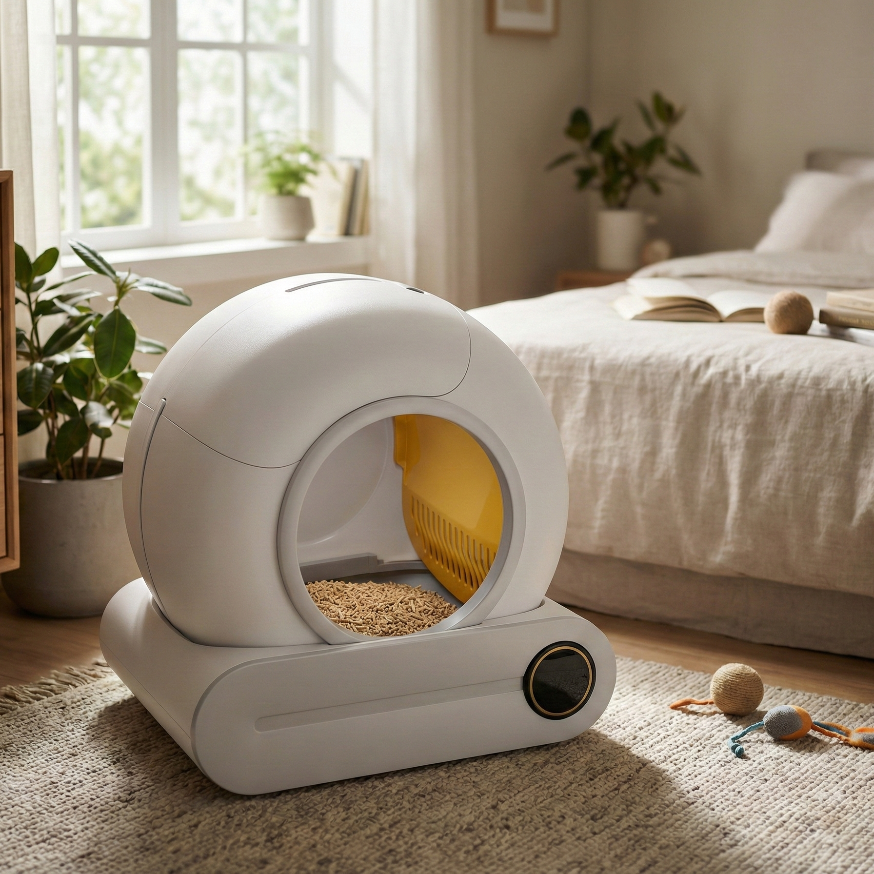 Litière automatique intégrant un système de rotation mécanique du tambour interne. L'appareil intègre une grille de filtration pour la séparation des résidus vers un bac de collecte situé dans la base. La structure sphérique est composée de polymère thermoplastique avec une ouverture frontale fixe. La façade comprend une interface de contrôle électronique circulaire. Le fonctionnement est régulé par des capteurs de détection de présence intégrés.
